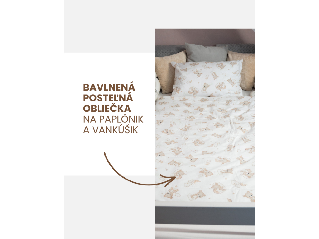 - Posteľná obliečka na paplónik (90x130 cm) a vankúšik (45x65 cm) – praktické zapínanie na zips pre jednoduchú manipuláciu.