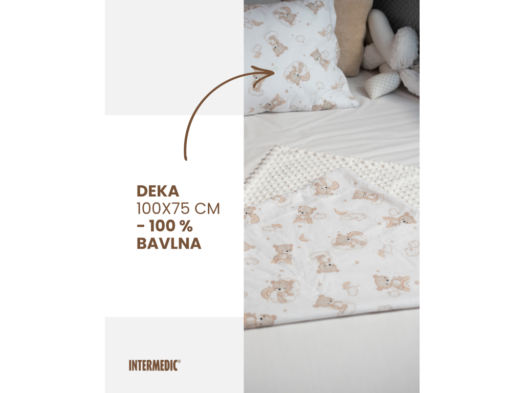 - Mäkká deka (100x75 cm) – kombinácia bavlny a minky poskytuje príjemné teplo a pohodlie.