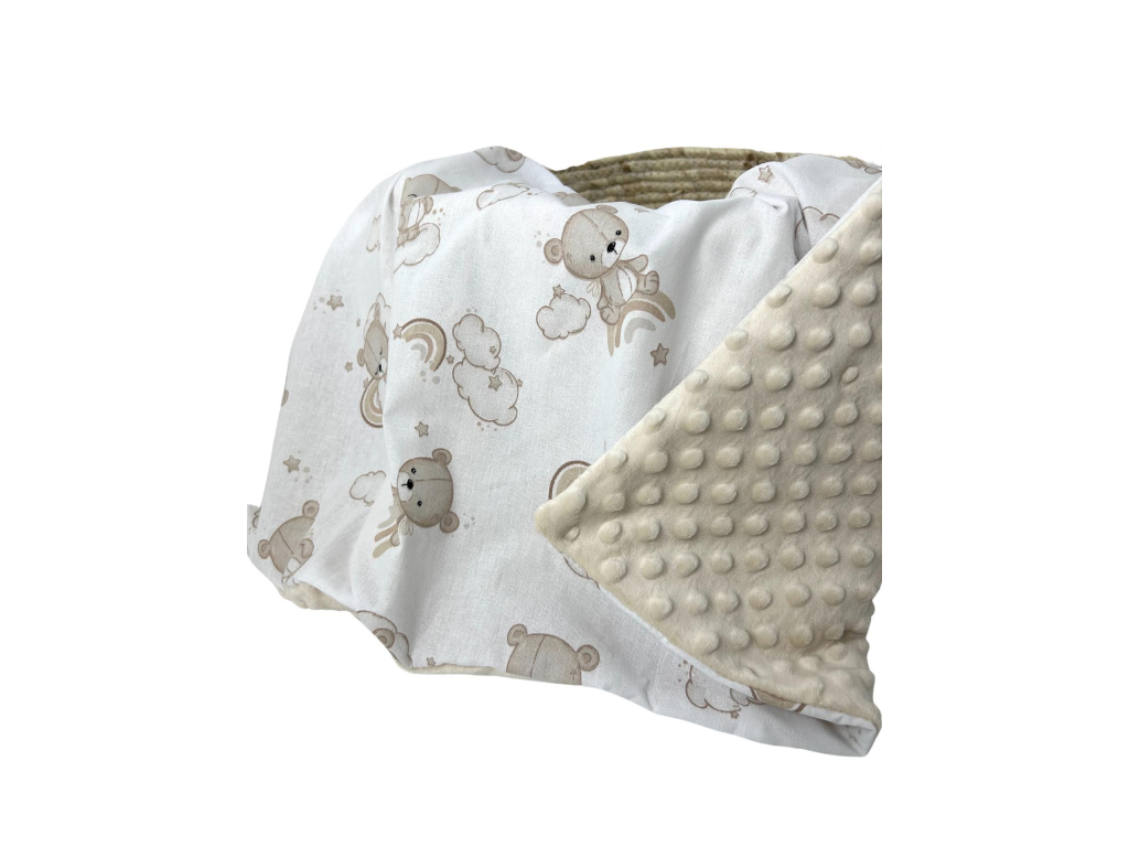 Deka Teddy je krásna detská deka, ktorá kombinuje jemný motív medvedíka na bavlnenej strane s mäkkou minky látkou v béžovej farbe. Rozmer 100x75 cm je ideálny pre použitie v kočíku, postieľke, autosedačke či ako podložka na hranie. Minky materiál je známy svojou výnimočnou hebkosťou a bodkovanou textúrou, ktorá je príjemná na dotyk. Vďaka kvalitným materiálom je deka priedušná, ľahká a nenáročná na údržbu. Výborná aj ako darček pre bábätko.