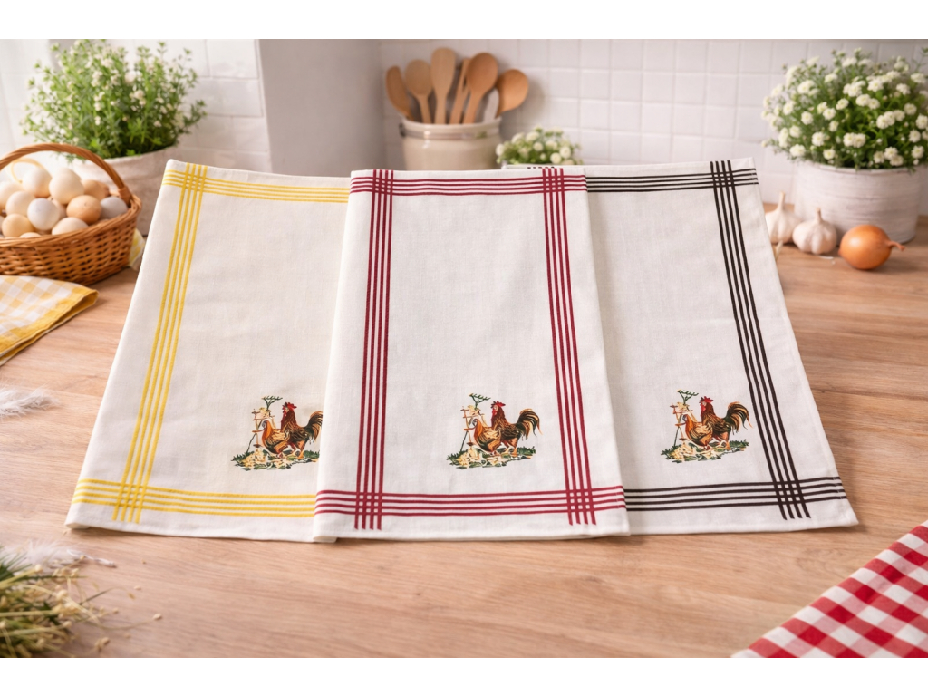 Spojte praktickosť, kvalitu a nadčasový vidiecky štýl vo vašej kuchyni. Kuchynská utierka Kohút je vyrobená zo 100 % prírodnej bavlny, ktorá vyniká vysokou savosťou, odolnosťou a príjemným povrchom. Vďaka tradičnému motívu kohúta a elegantnému farebnému rámovaniu je ideálnou voľbou pre každodenné použitie aj ako dekoratívny doplnok.