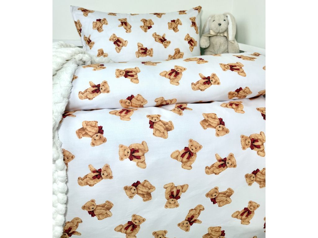 Detská posteľná obliečka Mackovia s mašličkou v rozmere 90×130 cm s vankúšom 45×65 cm je ideálna pre bábätká a menšie deti. Roztomilý motív medvedíkov s červenou mašličkou vytvára veselú, jemnú a útulnú atmosféru v detskej postieľke. Univerzálny biely podklad sa jednoducho kombinuje s akýmkoľvek interiérom detskej izby.