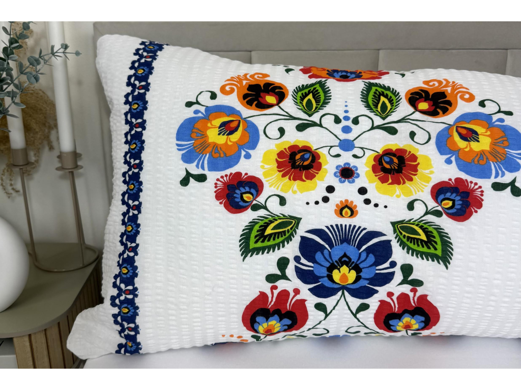 Doprajte si pohodlie a štýl s obliečkou na relaxačný vankúš Náhradný manžel v tradičnom folklórnom dizajne s modrým prúžkom. Výrazný vzor oživí vašu spálňu a zároveň poskytne maximálny komfort pri oddychu.