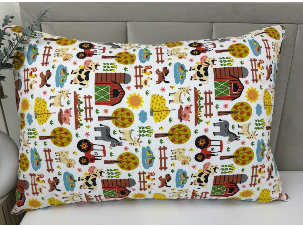 Doprajte deťom pohodlie a zábavu s obliečkou na vankúš Farm v rozmere 45x65 cm. Biely podklad zdobí hravý motív plný zvieratiek z farmy – kravičky, prasiatka, koníky, ovečky, kačičky a nechýba ani traktor, stodola či stromy. Farebný dizajn pôsobí optimisticky a rozžiari každú detskú izbu.