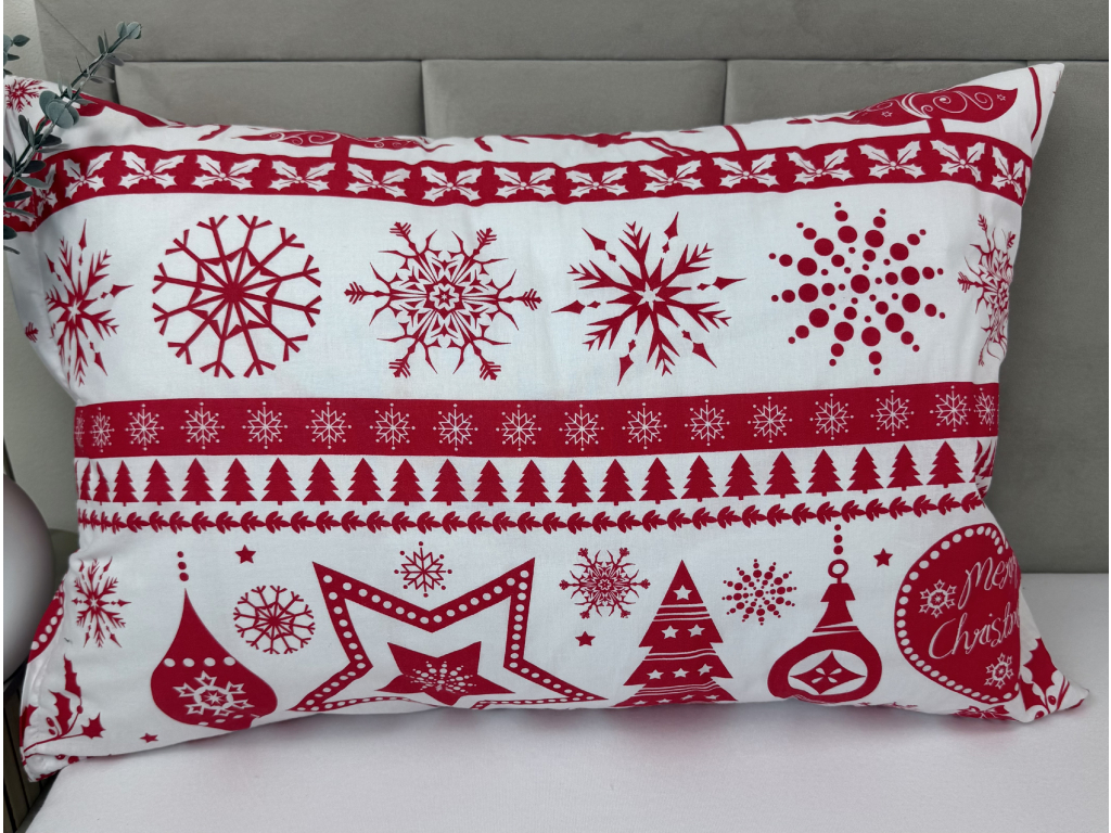 Dodajte svojej spálni či obývačke sviatočnú atmosféru s obliečkou na vankúš Merry Christmas v rozmere 45x65 cm. Na bielom podklade vynikajú výrazné červené motívy vianočných vločiek, stromčekov, hviezd a ozdôb, ktoré krásne doplnia zimnú výzdobu vášho domova.