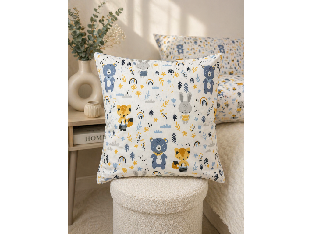 Oživte detskú izbu alebo obývačku hravou dekoračnou obliečkou Modrí Kamaráti 🧸. Roztomilý motív zvieratiek v jemných modrých a prírodných tónoch pôsobí príjemne, útulne a zároveň moderne.