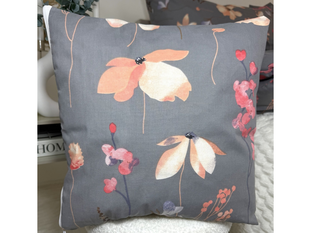 Dekoračný vankúš Romantická lúka je krásnym doplnkom k rovnomenným posteľným obliečkam alebo samostatnou ozdobou interiéru. Jemný sivý podklad so subtílnymi pastelovými kvetmi pôsobí elegantne, harmonicky a zútulní každú posteľ, sedačku či kreslo.