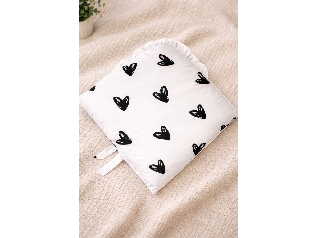 Štýlový dizajn v bielej farbe s kontrastnými čiernymi srdiečkami dopĺňa jemný volán po obvode, ktorý dodáva produktu elegantný a nadčasový vzhľad. Viazanie na mašličky umožňuje jednoduché a bezpečné zavinutie bábätka bez potreby zipsov či suchých zipsov.