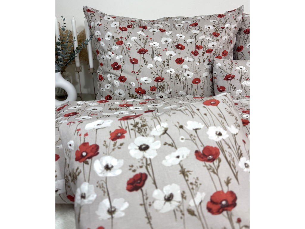 Posteľná obliečka Béžové maky prináša do spálne jemnú, prírodnú a elegantnú atmosféru. Béžový podklad doplnený o nádherné biele a červené maky pôsobí nadčasovo a harmonicky, vďaka čomu sa skvele hodí do moderných aj rustikálnych interiérov.