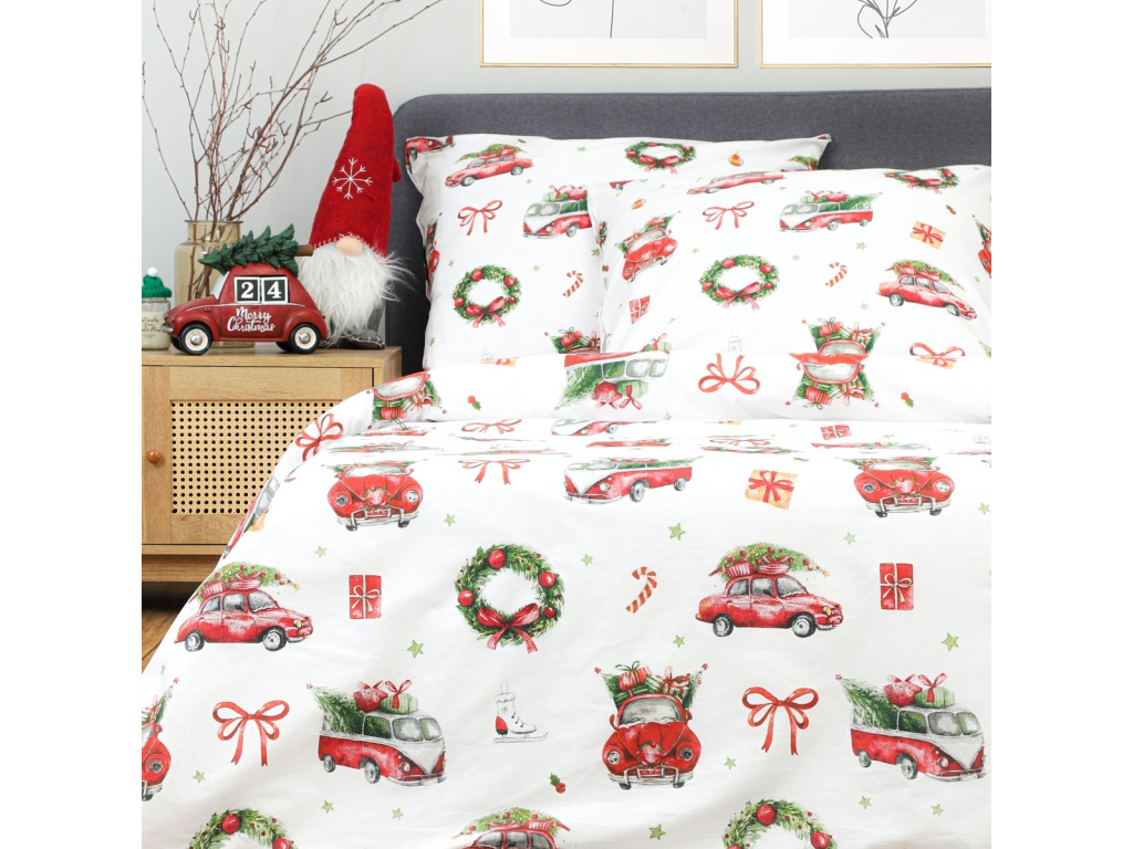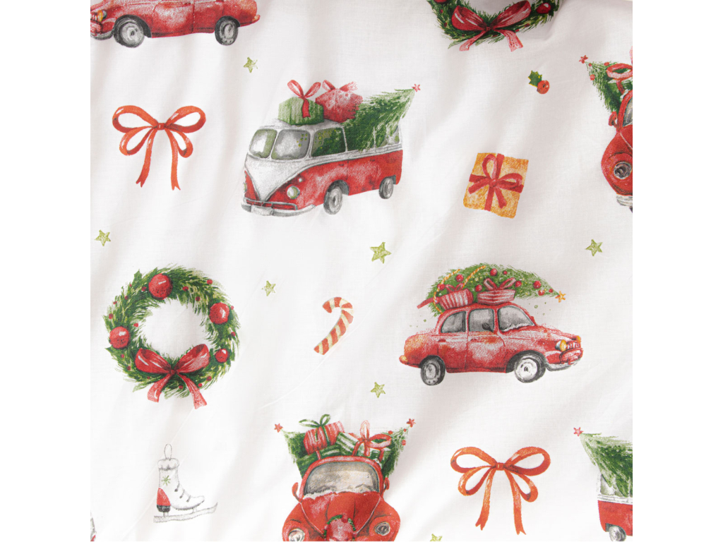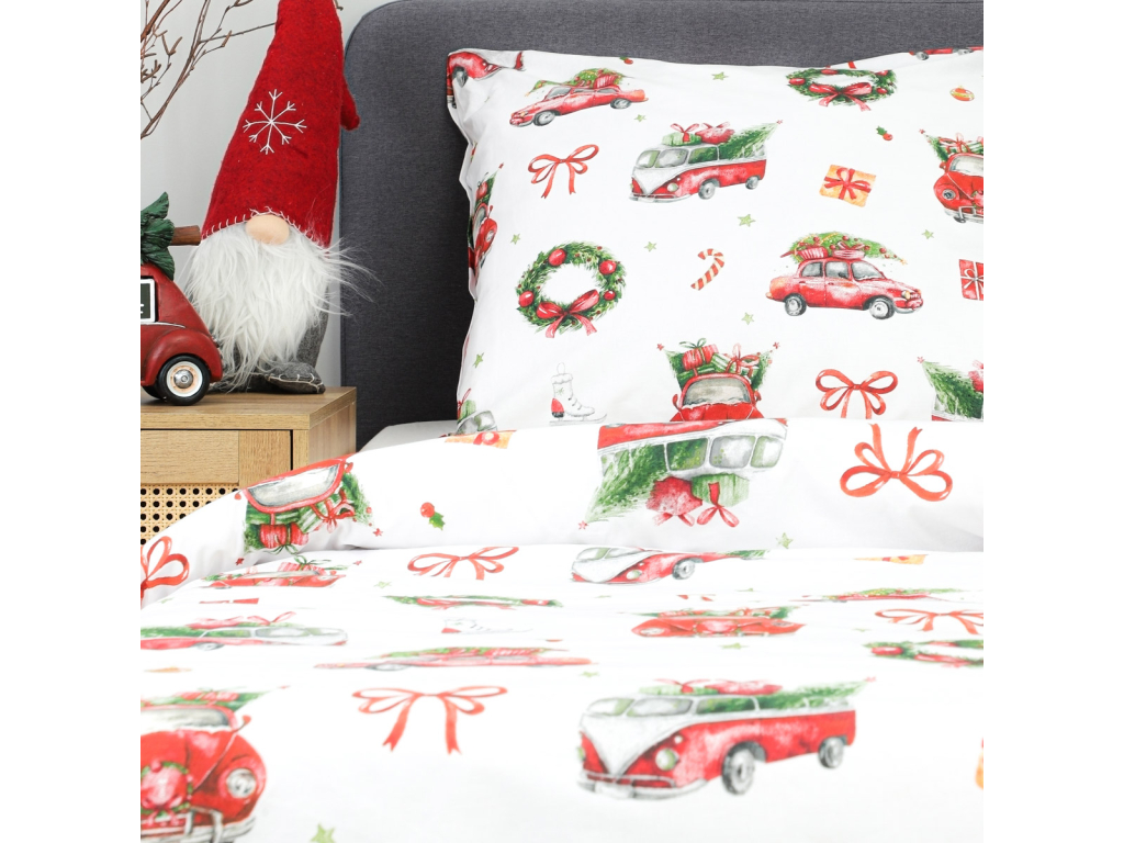 Vianočná posteľná obliečka Čaro Vianoc rozžiari vašu spálňu sviatočnou náladou. Na bielom podklade sa vyníma veselý motív červených autíčok s vianočnými stromčekmi, darčekov, venčekov a mašlí, ktorý vytvára útulnú a hravú atmosféru. Set obsahuje obliečku na perinu 200×220 cm a dve obliečky na vankúše 70×80 cm so zapínaním na zips.