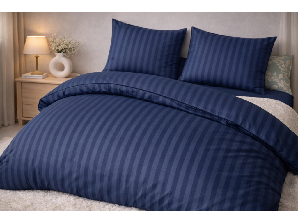 Elegantné hotelové povlečenie z damašku v modrej farbe je ideálnou voľbou pre hotely, penzióny aj domácnosti, ktoré hľadajú kombináciu štýlu, odolnosti a jednoduchej údržby. Nadčasový prúžkový vzor pôsobí luxusne a profesionálne, pričom sa ľahko kombinuje s akýmkoľvek interiérom spálne.