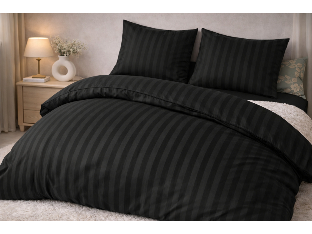 Hotelové povlečenie damašek v čiernej farbe ponúka dokonalú kombináciu jednoduchého dizajnu, vysokej odolnosti a dlhej životnosti. Vďaka decentnému prúžkovému vzoru pôsobí elegantne a profesionálne, pričom sa ľahko kombinuje s akýmkoľvek interiérom.