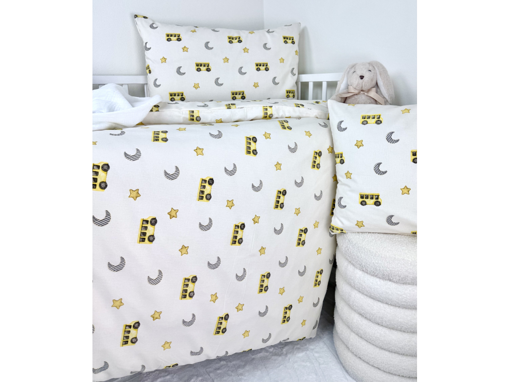 Potešte svoje bábätko alebo batoľa veselými obliečkami „Žltý autobus“. Ich jedinečný dizajn so žltými autobusmi, hviezdičkami a mesiačikmi na nežnom bielom podklade zútulní každú postieľku a vytvorí upokojujúcu atmosféru na spánok.