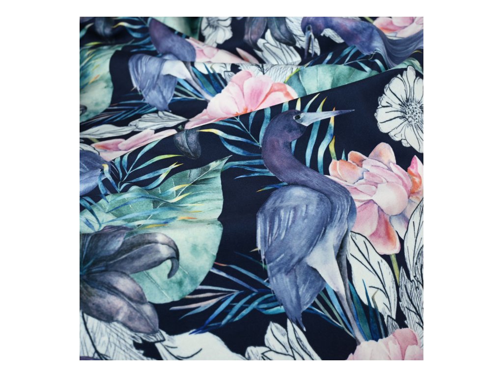 Tropický vzor s akvarelovými vtákmi a kvetmi v tmavomodrom základe dodá miestnosti wow efekt a zároveň pôsobí elegantne. Skvelo ladí s prírodným drevom, zeleňou aj moderným interiérom.